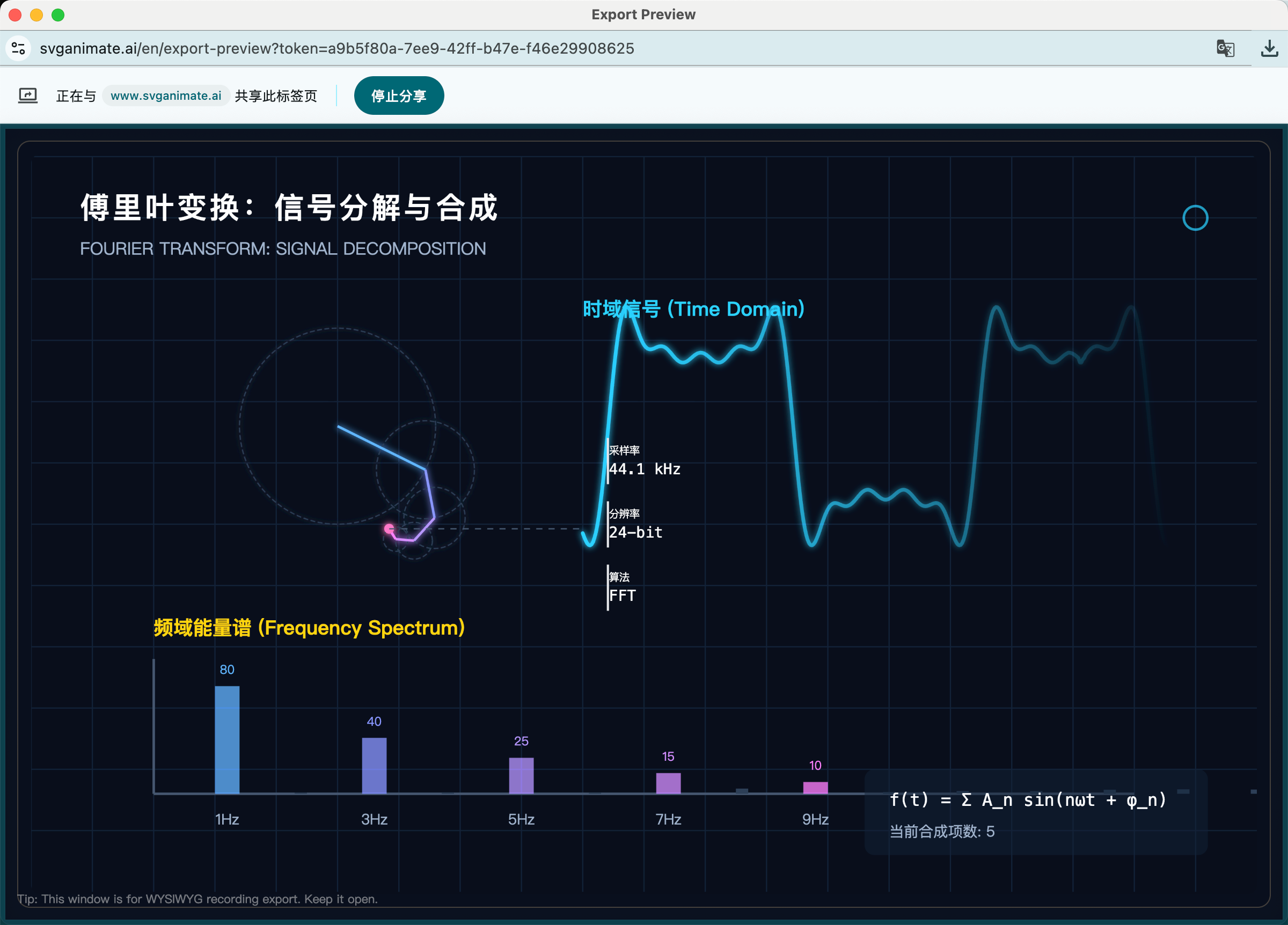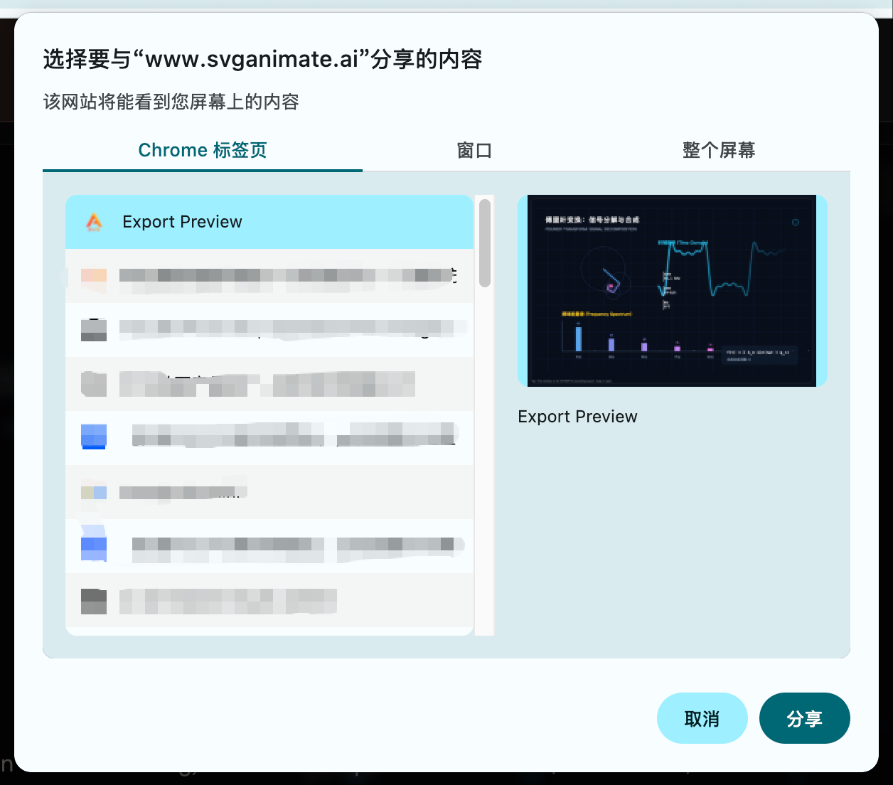 - In the dialog above, select the tab you want to record, then click the Share button in the bottom right. The browser starts recording the standalone animation playback page: