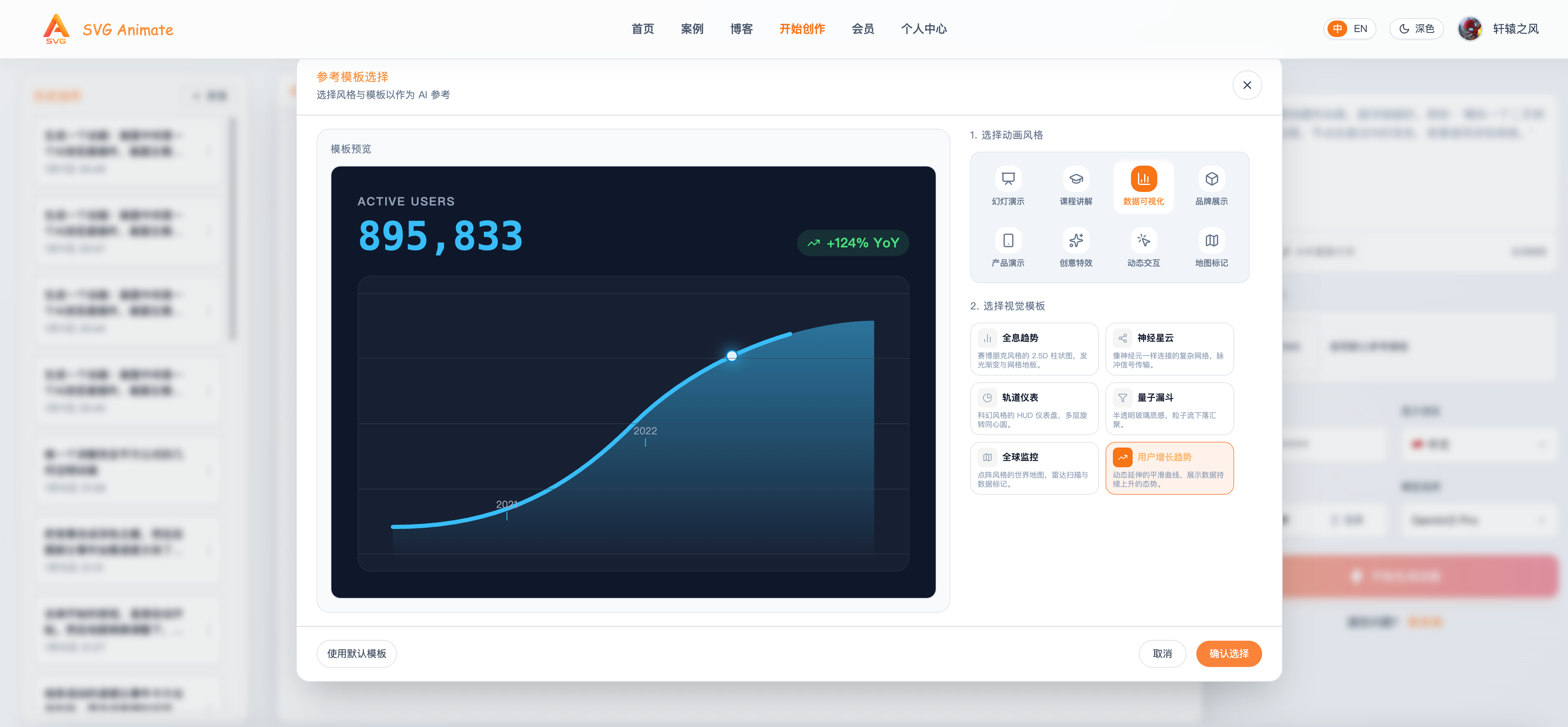 目前系统支持了幻灯片演示、课程讲解、数据可视化、品牌展示、产品演示、创意特效、动态交互、地图标记等八种常用风格。后续会不断迭代优化支持更多精彩丰富的模板,帮助大家做出更精美的动画。
