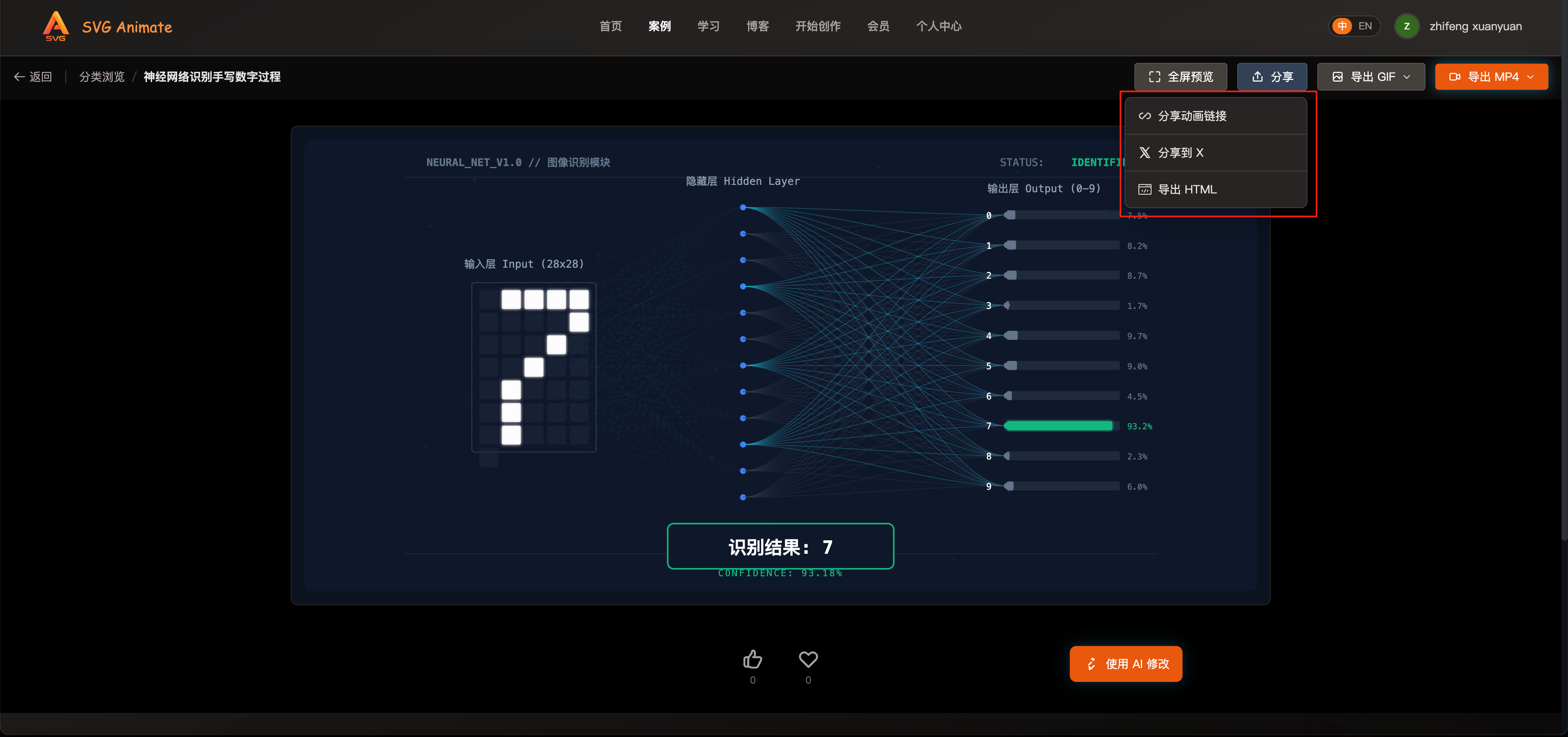 不过大部分用户公开的还是以学习和知识为主的动画,比如生成一个神经网络识别手写数字的动画:
